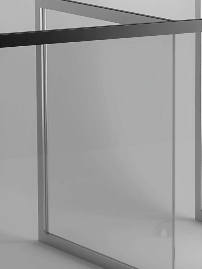 Junção entre vidros em perfil de policarbonato autoadesivo com tratamento UV ou fita dupla autoadesiva dupla face.